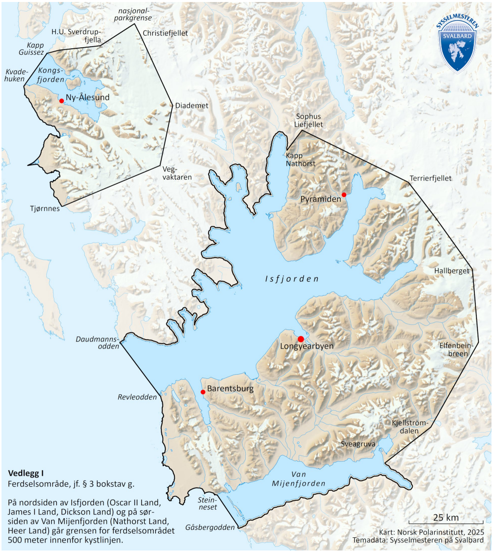 For forsknings- og utdanningsvirksomhet og tilreisende er det forsikringsplikt ved ferdsel utenfor ferdselsområdet (se kart under).