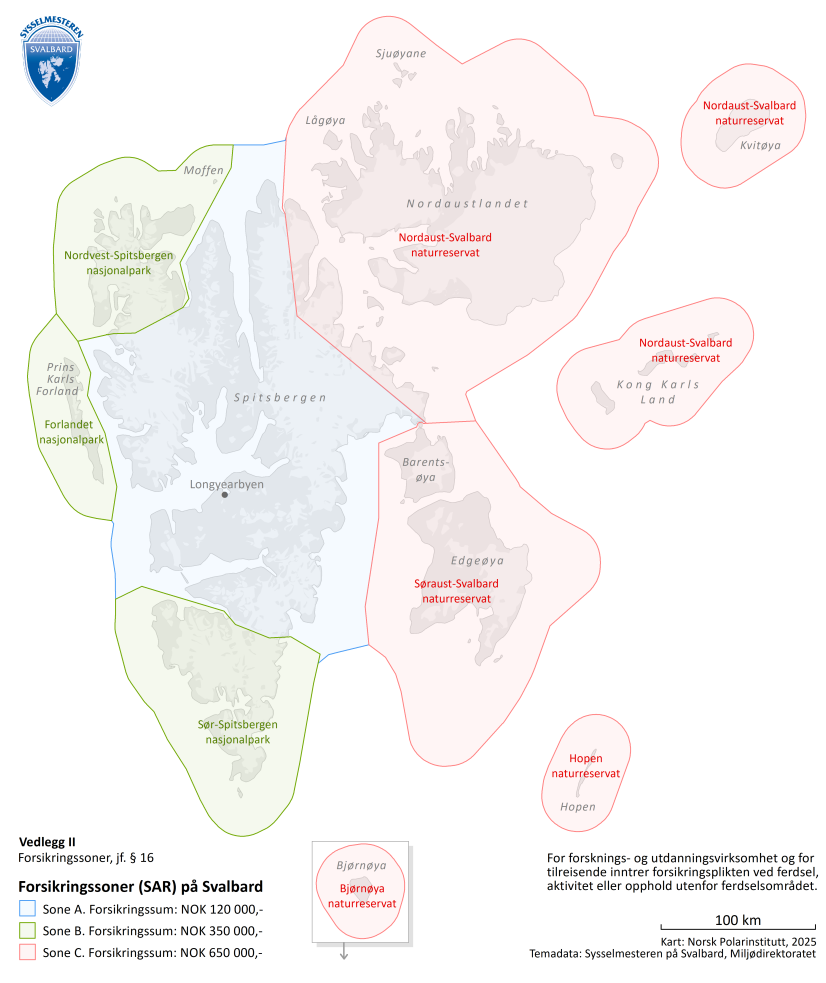 Det er krav om forsikring for og dekning av redningsutgifter (SAR) på Svalbard.